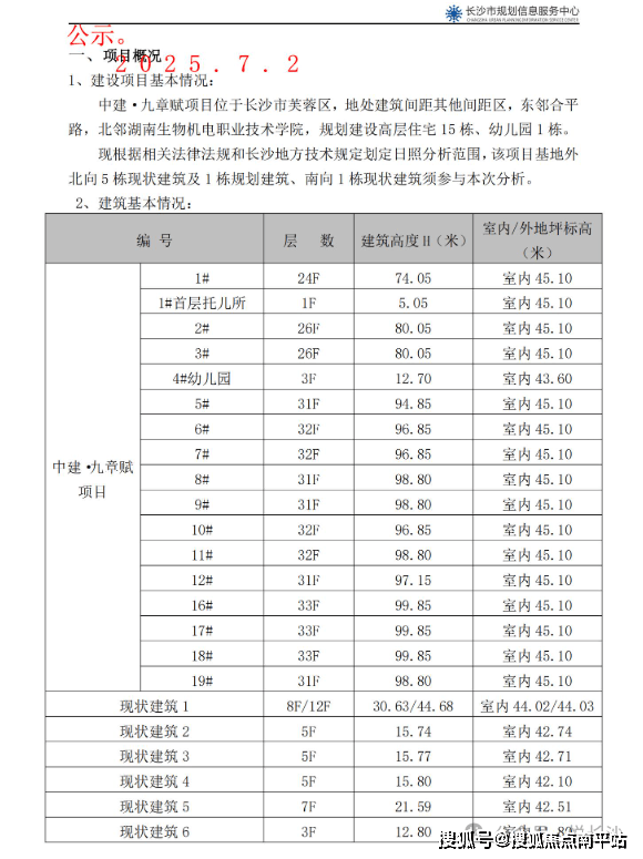 7月2日,长沙市自然资源和规划局发布 中建·九章赋总平面图批前公示。