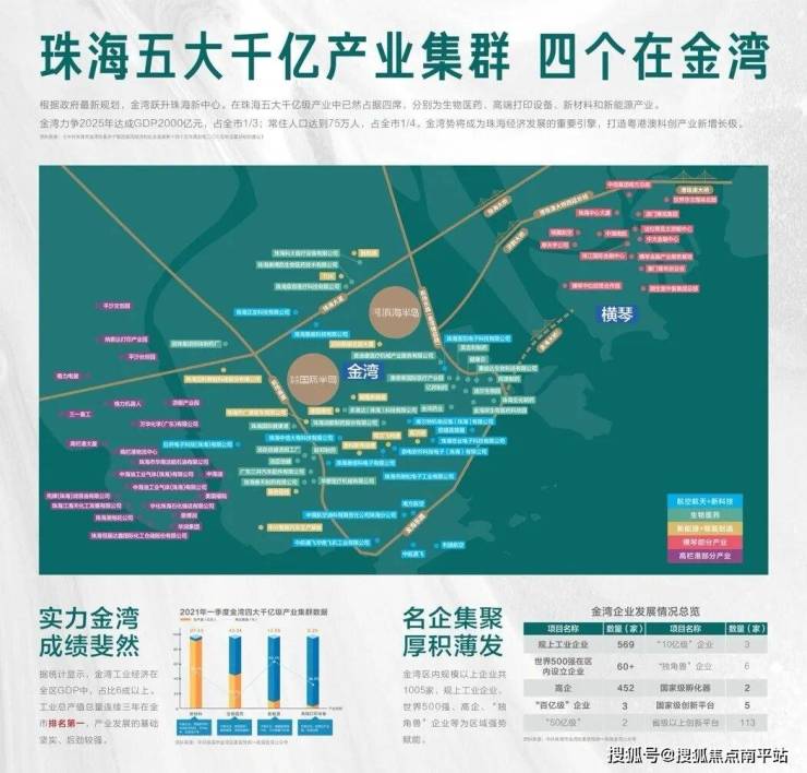 金湾打造四大千亿产业集群,成为粤港澳新兴高端产业增长极。2016-2020年,金湾生产总值增速珠海第一,现有高新技术产业451家。