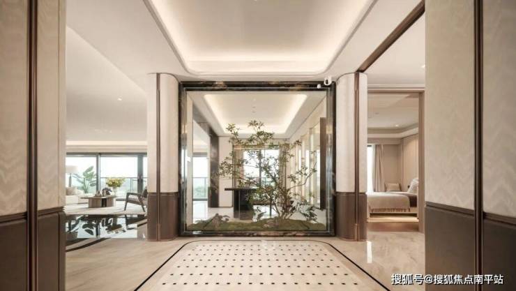 在华发的统筹下,建筑、景观、室内实现一体化设计。从建筑的“未来舱” 转角玻璃、钻石切割立面,到景观的“凤凰溪谷”立体园林、叠瀑静湖,再到公区的玉石背景墙、水刀拼花地面,均采用统一的设计语言与符号元素,呼应“凤凰羽翼”的核心主题。