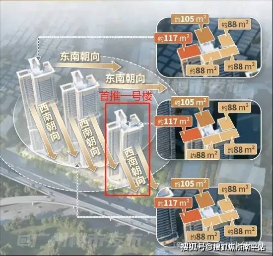 项目共规划有3栋楼,主推88-105-117平三个面积段。