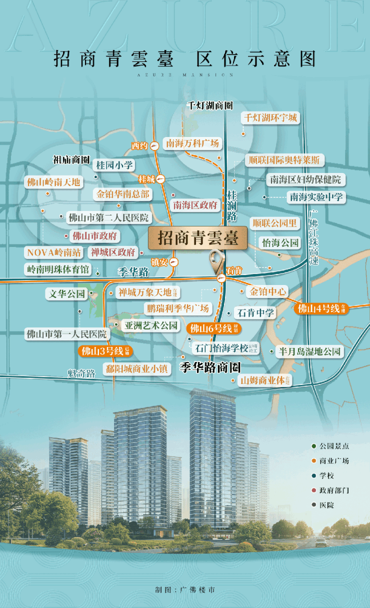 招商青雲臺身处桂澜路与季华路双轴核心区位,自驾去禅桂很方便。且坐拥三地铁,直线距离地铁3号线镇安站约800米,南侧靠近4号线(在建)和6号线(规划)石𬒔站。