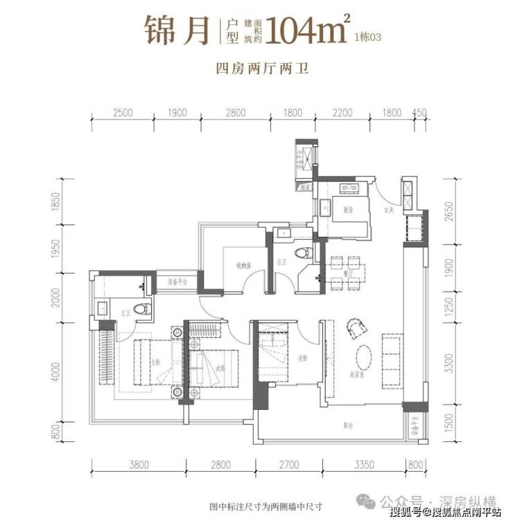 ▲锦月·建面约104㎡4房2厅2卫:南向四开间,6米阳台引景入室,自此生活融于风景。