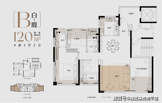 建面约120㎡户型,则是追求一步到位的全能户型,相当于老规建筑面积约159平户型。它以灵动四房的格局,美好适配了二孩家庭或需要独立书房的改善需求。其约40㎡的LDKB一体化巨幕方厅,更是营造了媲美大户型的家庭社交场,将生活的品质感与空间的实用性,做到了美好平衡。