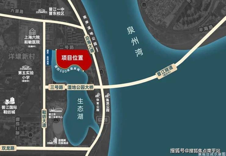 项目所在的晋东板块与东海核心区仅一桥(晋江隧道,规划中)之隔,板块更是内生泉州顶级的交通、文体、医疗等城市资源。项目周边沿海大通道、双龙路、晋新路等交通便捷, 可达性高,南侧有晋江第二体育中心, 西侧有和敏医院、第五实验小学分校、鞋纺城等,全方位满足塔尖圈层生活需求。