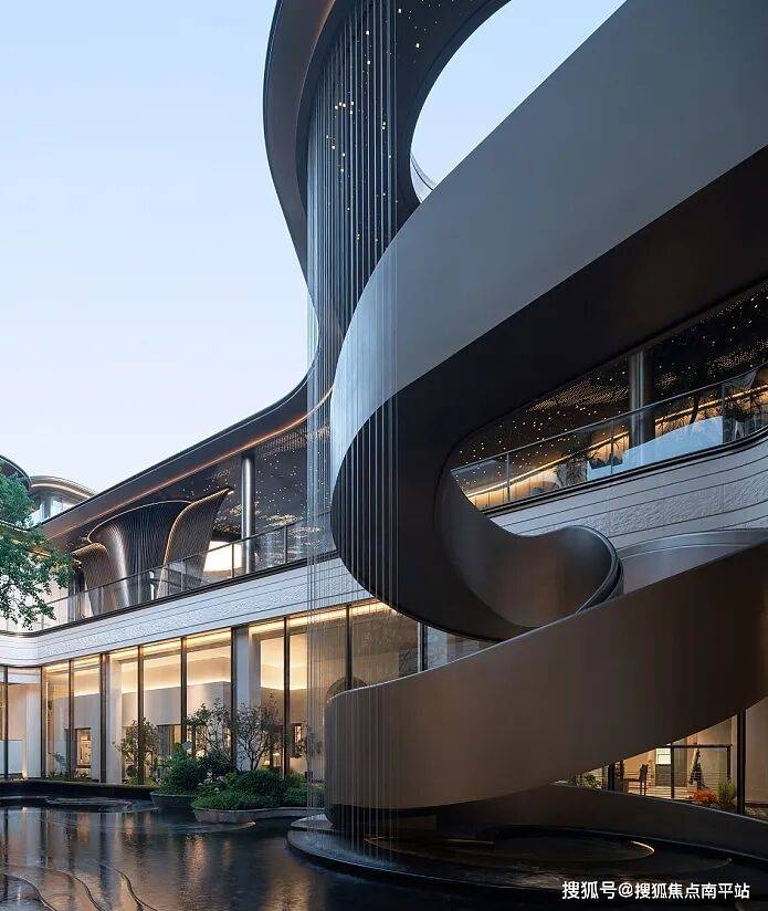 水影潺潺,如飘带般的建筑曲线,仿佛悬浮在水面之上。