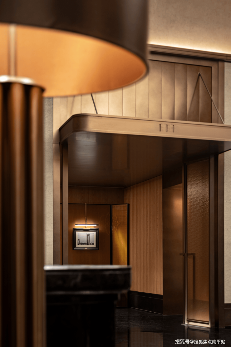外立面采用香槟金铝板搭配 270°弧形转角玻璃幕墙, 突破超高层住宅锐利直角的传统做法,且所有玻璃幕墙拐角处都做出弧度,打造少有的全景舱视野不仅赋予建筑以通透灵动的气质,更让每一道光线流畅穿梭,勾勒出无与伦比的流线美感。
