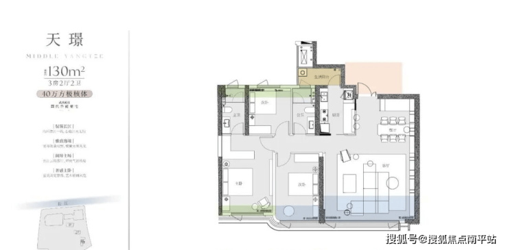 ①130㎡户型:三房两厅两卫,3号楼中间户,南北通透,三开间朝南;户型本身的布局还是比较方正的,并且有多处优化空间,厨房外还带一个生活阳台,可以用于后期晾晒,保留客厅阳台的纯粹性。但这一户型北面为连廊,加上客厅朝南设计,基本上没什么看江视野,主打优势是面积小,总价门槛低(项目内最低门槛)。