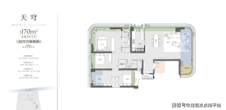 ③170㎡户型:四房两厅两卫,整个户型的布局与江面基本平行了,对比3号楼另外两个户型,170平户型的看江效果要优秀不少,客厅(270度观景)、主卧、主卫、厨房这几处空间都拥有不错的江景视野,观景面还是比较可观的。不过为了看江,这个户型的进深做的比较大,通透性稍显不足。