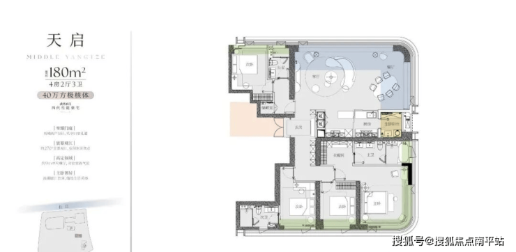 ④180㎡户型:四房两厅三卫,客厅、北向次卧拥有非常不错的看江视野,并且客厅可以270度观景;另外,东头这一户型的生活阳台、主卧套房也可以看江,观江面更大。但东头户型离3号楼较近,低楼层采光可能有所影响。