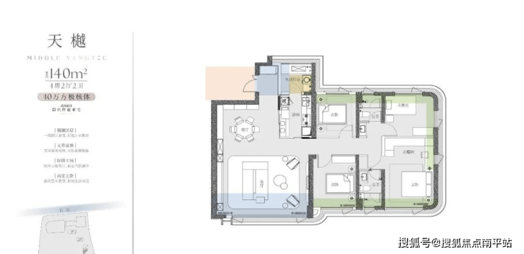 ②140㎡户型:四房两厅两卫,该户型南北通透、三开间朝南;因为3号楼的楼栋朝向、位置,属于北向看江,因此,这一户型的北面房间——次卧、儿童房拥有还不错的看江视野(中高楼层以上房源)。客厅空间相当的开阔,动静分区做的也比较好。