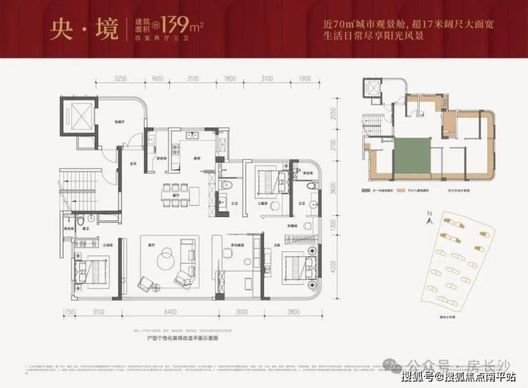 建面约139㎡户型,套内实得面积约154㎡,得房率约110%(不含电梯厅),可媲美旧规170㎡大平层;