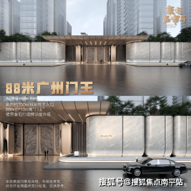 不仅如此,立面设计采用大面积玻璃幕墙与金属铝板材质,形成流动感与光影效果交织的视觉语言,建筑气质沉稳而不失先锋,营造出“国际化+都市雅奢”的高识别度立面效果。项目主入口更是以88米门面宽、10米通高的“门王”姿态,成为广州门面级封面之作。