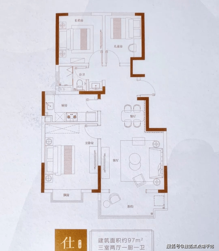 值得注意的是,96平三室两厅的户型仅有一室一厅为南侧朝阳。