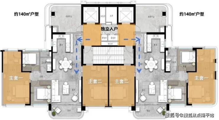140㎡户型:2梯2户专梯入户的纯板楼设计,双主套三卫保证每位家庭成员的居住舒适度,长辈房朝南还近门口,两代人住一起互不打扰,各自拥有绝佳私密性。