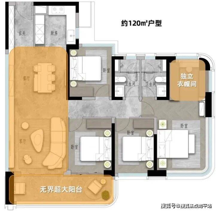 120㎡户型:珠江新城首个同尺度下做到四房两卫的创新型产品,约6.7m的双面宽阳台连通客厅和次卧;主套设置了专属衣帽间,与卫浴空间隔墙分开。