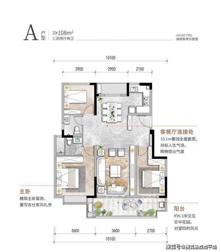 108㎡的三房两厅两卫,让人爱不释手的精致小户。但却突破性的实现南北通透,且拥有约9.9米的超宽全屋面宽的双阳台设计。户型规划餐客厅一体,加上6.3米的交互空中花园阳台,通透格局采光充分,在家中即可对望四时风光,精致又不失空间感。
