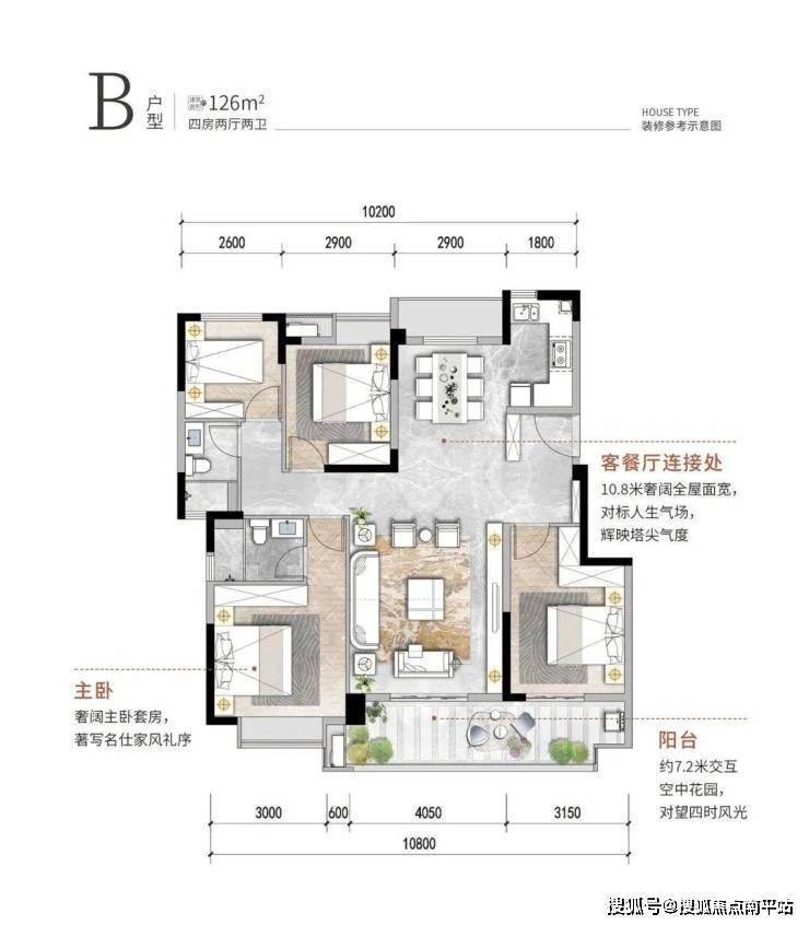 126㎡的四房两厅两卫,是有初步改善需求的优先选项。户型三开间朝南,户户南北通透,加上10.米的全屋面宽与7.2米的交互空中阳台,采光量与通透感加量,生活体验感再上台阶。套房式的主卧带飘窗搭配三次卧,更能满足二孩家庭需求。