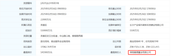 早在今年初2月26日,长沙蛇年土拍首宗住宅地块出让,位于定王台街道、蔡锷路两厢,距离五一广场仅500米,是近些年来位置最好、最靠近市中心的地块。经过30轮竞价,由湖南融璟置业有限公司以141900万元(溢价29%)摘得,折合楼面价约9435元/平。