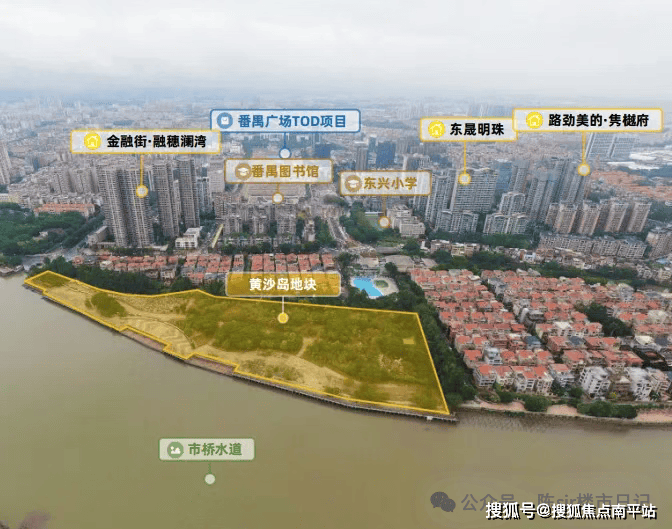 黄沙岛地块位于番禺中轴线 番禺广场板块的 最南端,紧贴市桥水道,四面环水,形成天然岛居地形。