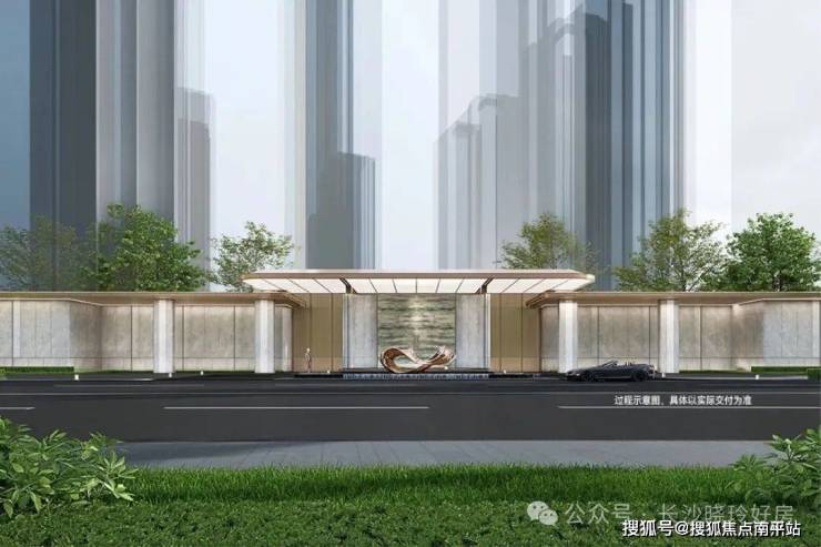 高门大院:中央景墙约7.5米恢弘石材高门,连接两侧构成超80米巨幅门仪,气度不凡;