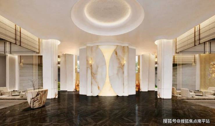 项目大手笔用波斯白玉定制奢石铺陈,配定制云石壁灯迎宾,并在 连廊两侧设置社交卡座,更贴合日常需求。