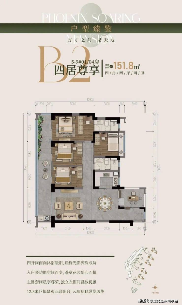 151㎡奢阔四房:约13米南向四联阳台,引景入室,四开间朝南。独立入户空间灵活可变,套房式主卧兼具私密与尊崇。