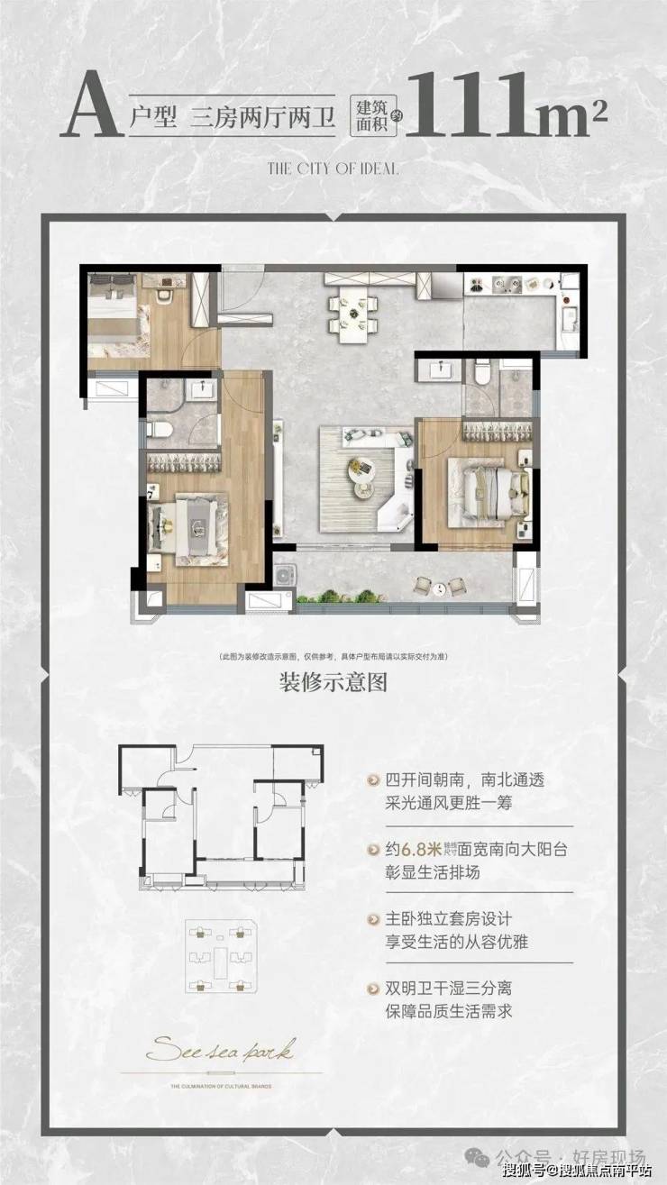 ③产品。项目规划6栋高层住宅,户型为建面约111-170㎡经典户型。2栋第四代住宅,每户配置约35㎡空中花园,实现“户户有景、家家有园”的生态愿景。