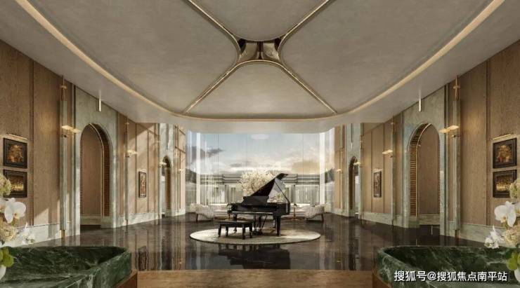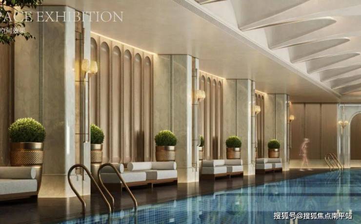 看完了健身房和泳池,园长基本可以判定润和的公区用的是海派风格(最近非常流行),可以隐约看到墙体和包柱都有一定复古的线脚。浅色的石材和岩板搭配上Fancy的曲面吊顶,还是会有眼前一亮的感觉。