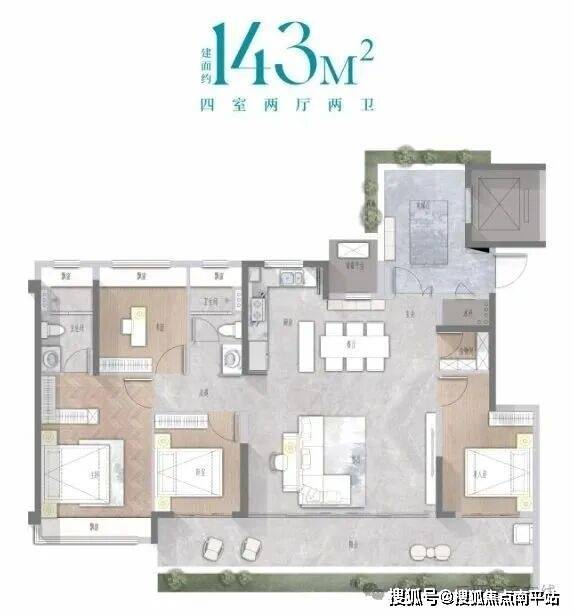 建面约143㎡平层奢宅:方厅+双厨设计,适合多人家庭欢聚