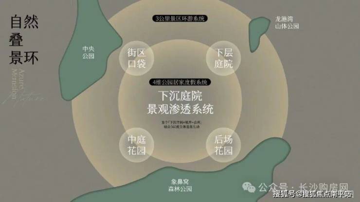 3公里景区环游系统:项目择址梅溪湖三公园心,坐拥象鼻窝森林公园、中央公园(规划)、龙王港山体公园(规划)生态密境,构建3公里自然环游