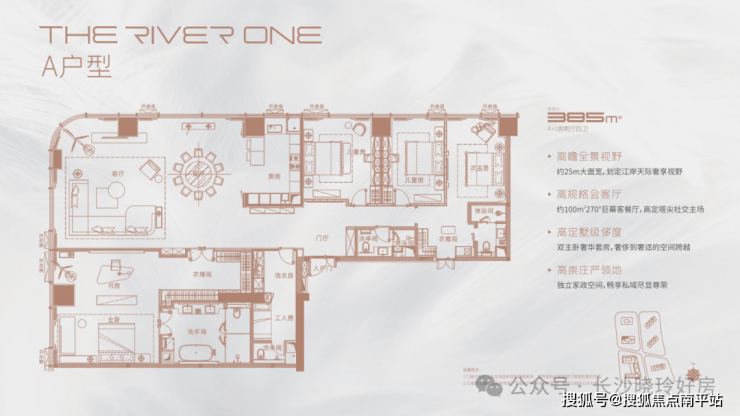 人均百平化起步:打造建面约321-1200㎡江景峯值大平层,超越墅级生活侈度。