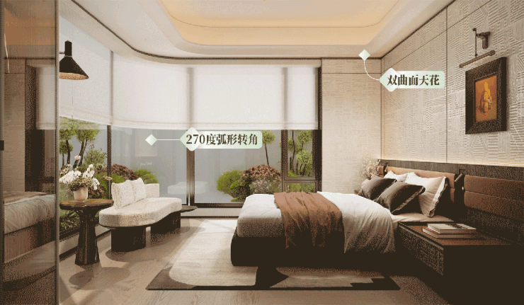 保利灯湖天珺给出的答案,就是在主卧和阳台打造出双U型弧面全景舱,不管从内看还是从外看,整个建筑都有了更显质感的曲线线条。