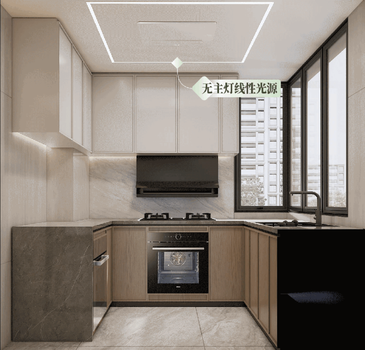 甚至,不显眼的细节也不放过:卫浴替换成线性浴霸,厨房也采用无主灯的线性光影...