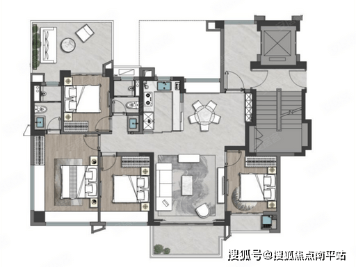 四房格局、动静分区、主卧套房、客厅连通阳台