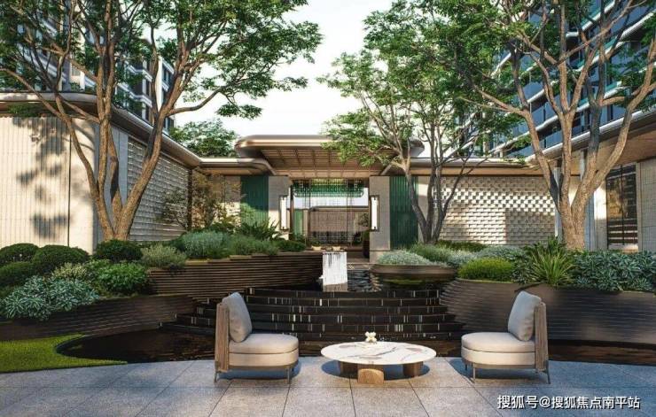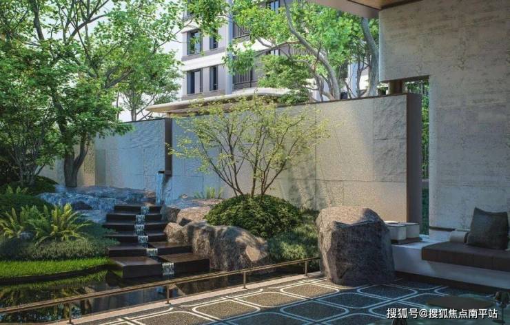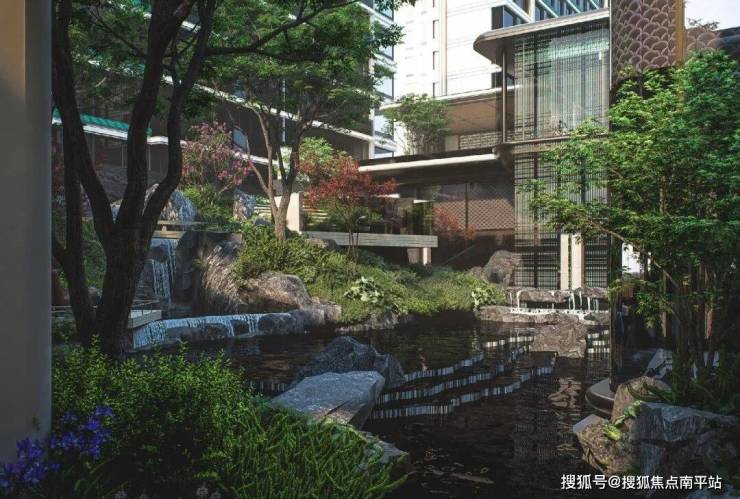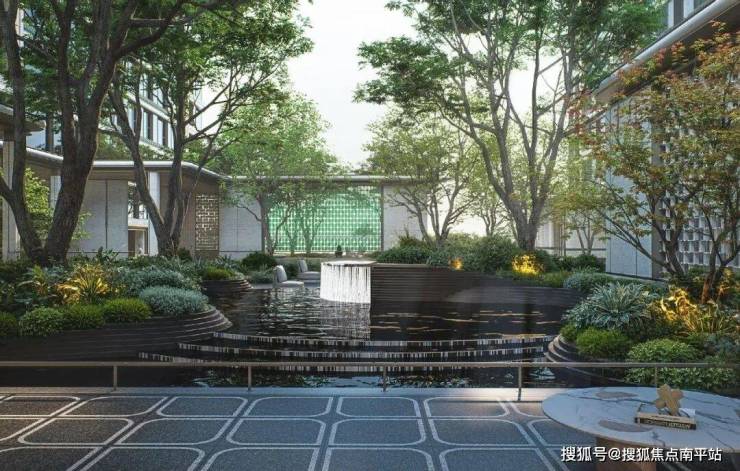 除了叠水景观的灵动以外,水面还与绿植、小品相呼应,实现从游园到归家的自然过渡。