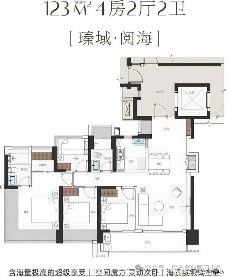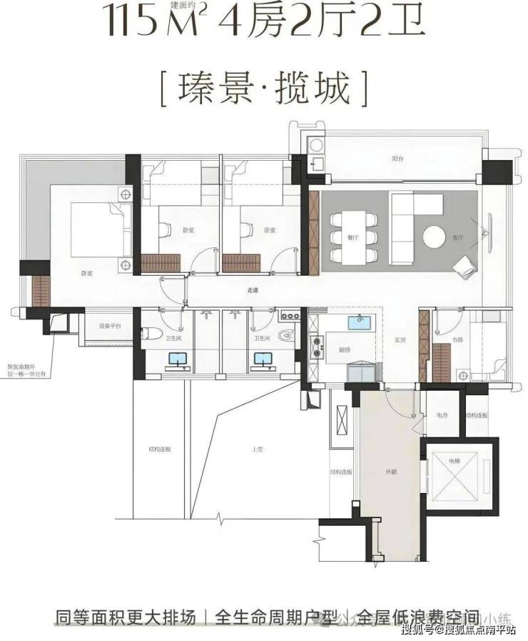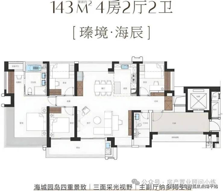 提供114-143㎡的四房及以上大户型,均为纯商品房,无保障房混住,业主圈层纯粹。部分户型采用新规设计,得房率较高(约108%),且专梯入户、独立玄关,提升居住私密性和实用性。138㎡、143㎡户型南北通透,采光和通风条件优越,空间布局合理。