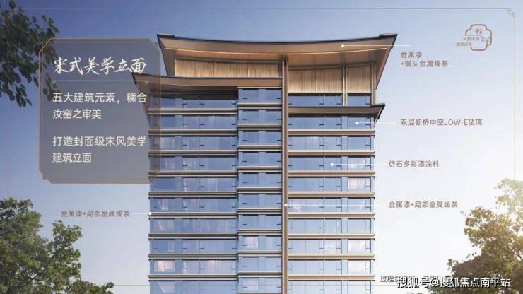 臻材实料:东方美学公建化立面,宋韵飞檐造型,高级配色金属材质线条+隔音隔热性能俱佳的LOW-E玻璃+深灰色真石漆基底,打造历久弥新的美学立面。