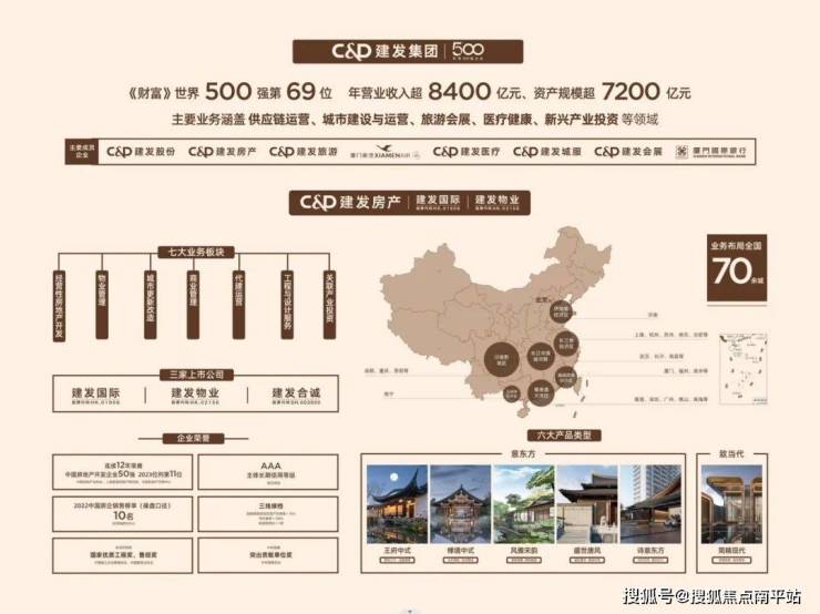 建发集团,成立于1980年,2023年《财富》世界500强排名第69位,主要业务涵盖供应链运营、城市建设与运营、旅游会展、医疗健康、新兴产业投资等领域,集团年营业收入超8400亿元,资产规模超7200亿元。建发地产,连续13年获得“中国房地产开发企业50强”,成立40余载业务遍及全国70余城。