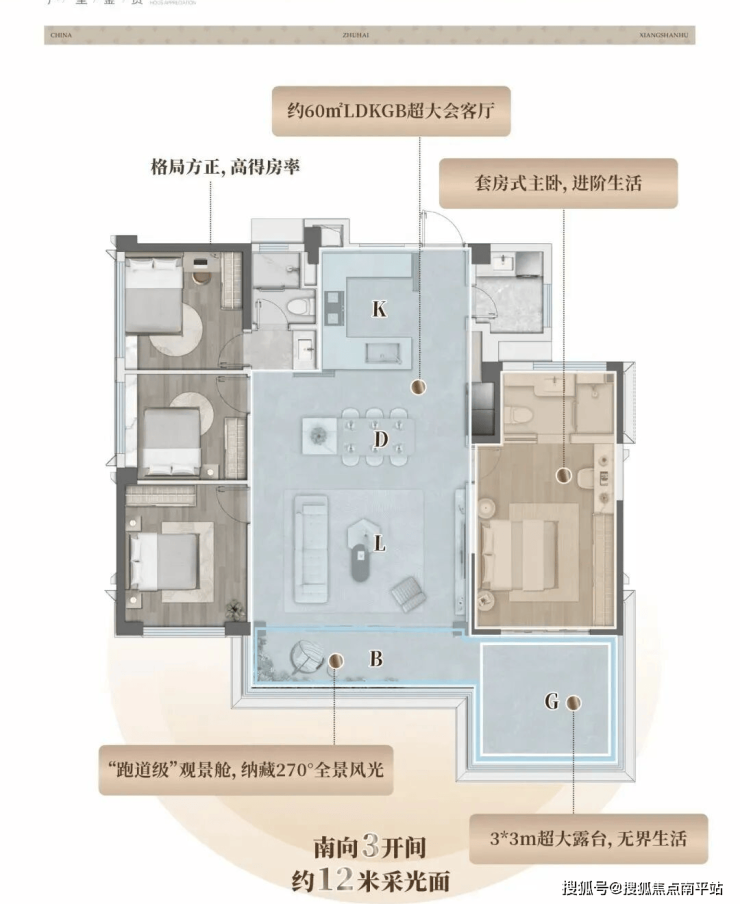 室内,该户型将传统LDKG格局加以升级,让客餐厅、厨房、景观阳台与大露台相连,打造约60㎡家庭活动领地!实现大平层的居住体验。
