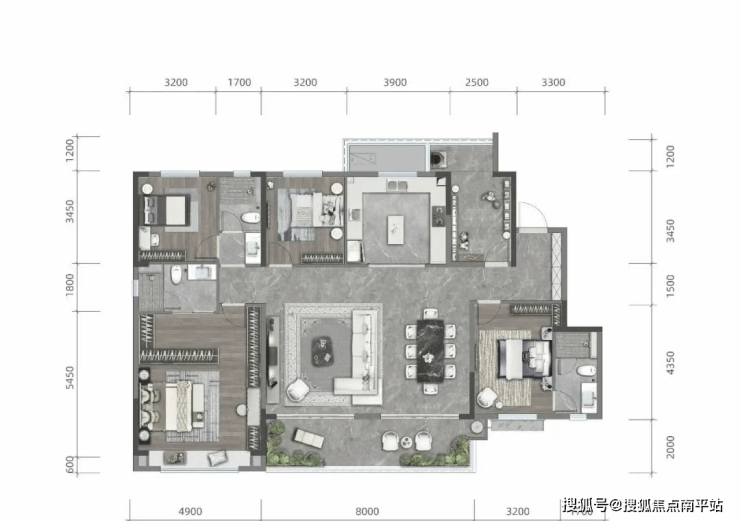4+1房设计,大横厅开间约8米,如此尺度在别墅和洋房里非常少见!约17.8m南向超大面宽!约16㎡跑道式阳台!市场罕有3套房设计,南向主卧套房开间近5米,带独立的全房式衣帽间!