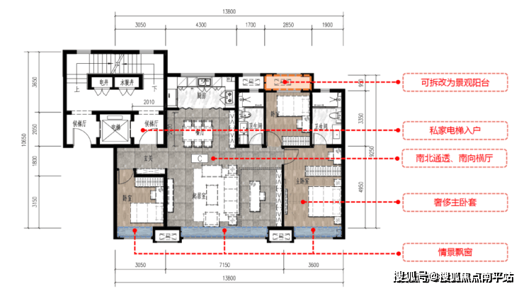 【 135㎡】三房两卫,可变四房,约 7.15m宽横厅、 4.1m宽餐厅、 3.6m宽主卧, LDK餐厨布局,独梯入户、纯私享公区,设备平台拓展北次卧 扩大赠送率, 空间布局具有绝对优势。