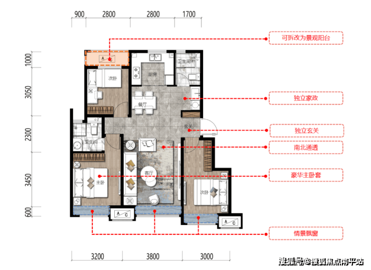 在 户型的设计上,通过 精准推敲空间尺度,打造 宜居空间布局、舒适的流线设计和溢价赠送空间。紧凑的空间布局,不浪费每一寸面积;两卫及干湿分离设计彻底解决卫生冲突;家政空间或生活阳台让家更整洁;独立玄关让出入更方便;U型厨房同样的面积更多的使用空间;情景飘窗符合多元品味的更多选择;餐客厅一体让空间更开阔;景观阳台、超大设备平台,更多赠送空间。