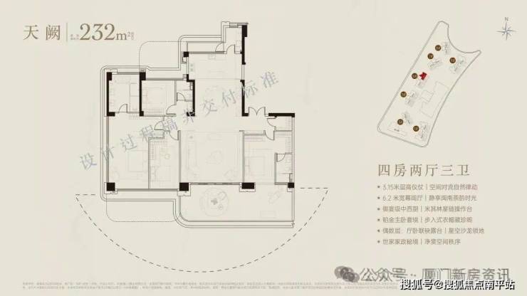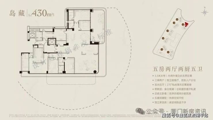 厦门首个60米悬挑海无边际泳池+25米室内恒温泳池,辅以休闲吧、茶室、观景平台,等共计2000平空中会所。首发七衡系统科技配置(衡温、衡湿、衡氧、衡净、衡洁、衡静、衡光)实现低碳环保的居住品质。