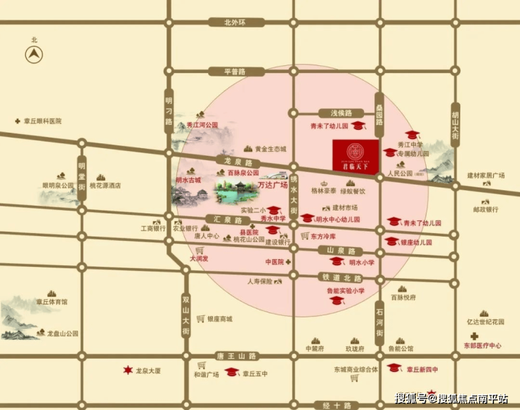 周边景观配套:建筑可以重建,名胜不可复制,闻名遐迩的百脉泉公园、明水文旅古城、秀江河公园距离本项目仅 1500米,更有桃花山公园、章丘体育场环伺周边。百脉泉公园,明水古城,秀江河公园,桃花山公园,章丘体育场,皆在10分钟生活圈。