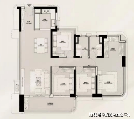 建面约140㎡的四房两厅三卫,独立电梯间,双主卧套房。