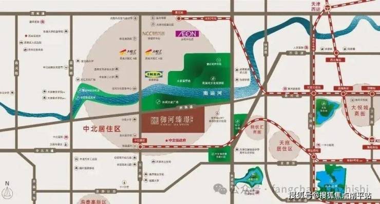 先说说它的“天生贵气”——御河臻璟落子天津市规划的“西部新城”核心腹地,距离市中心仅4公里,板块四分之一的土地已融入主城肌理。这里是中北板块,环城公认的“最醇熟居住区”,十几年来,商业、交通、医疗的烟火气早已与市区无缝衔接。