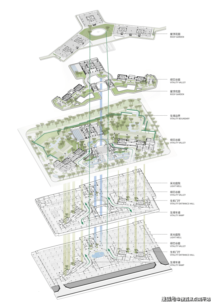 既定的“双Y形+L形”布局在城市网络中呈现异化的空间结构。设计运用立体分区与“生境底盘”理念,优化尺度与空间引导,消解异构布局的疏离感,并以差异化建筑形象与高效可达性强化坐标性。
