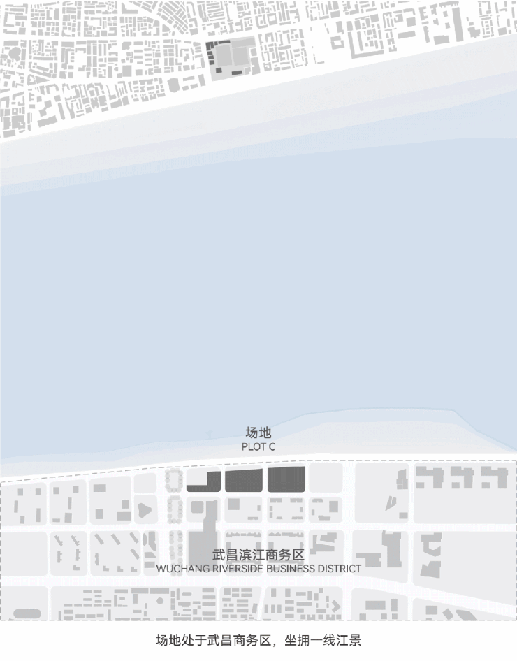 武汉长江中心位于武昌内环滨江核心水岸,地理位置优越,辐射力强。总用地19.4万平方米,已建设380米超高层办公塔楼、商业中心和高端住宅。C地块为唯一待开发的一线沿江用地,由两块矩形和一块L形地块组成,被城市道路分隔。