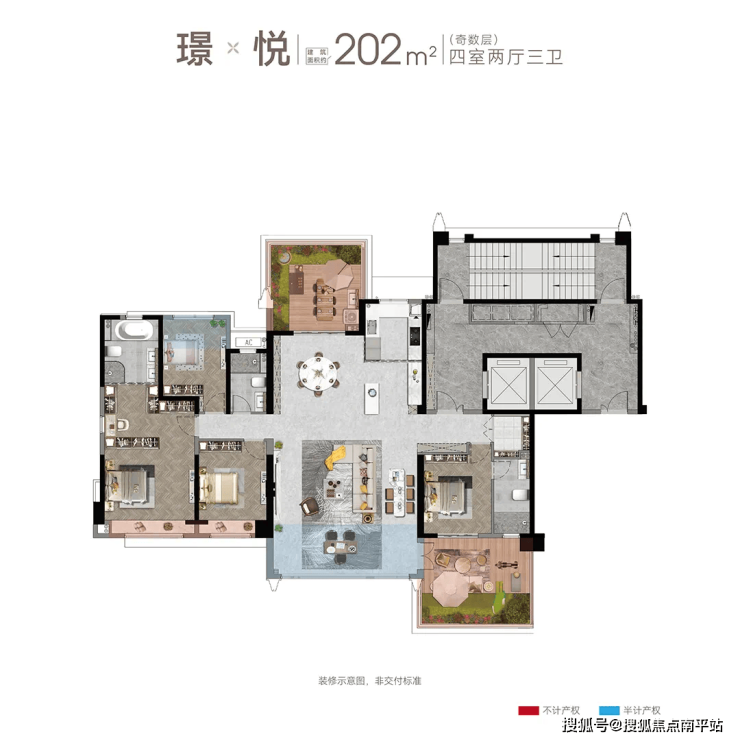 错落式花园排布,可扩大奇偶层采光面积,更加合理规避上层空中花园板对下层住户的采光遮挡,也让更多的阳光、空气进入庭院和户内空间。