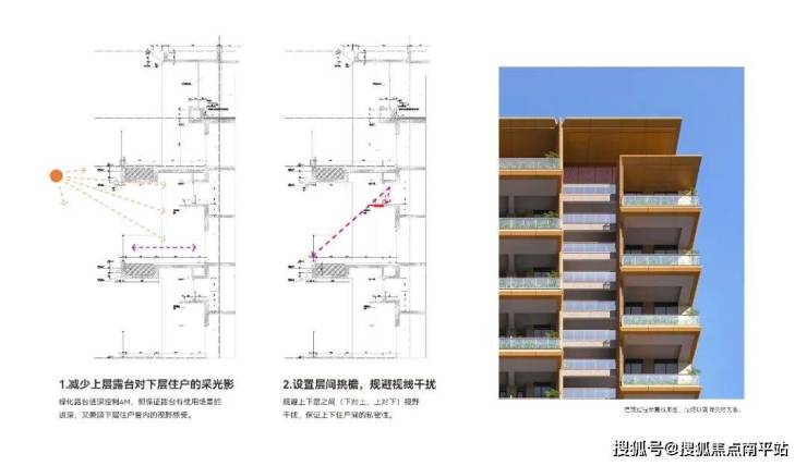 在外造型线脚采用斜切和收分的立面处理,设置层间挑檐,将绿化空中花园进深控制最长可达约4M,临分户之间空中花园栏板适当加高并使用磨砂玻璃等一系列创新设计手法,有效避免了上下层、左右户的活动、视野、灯光、噪音干扰,最大程度保证住户隐私。